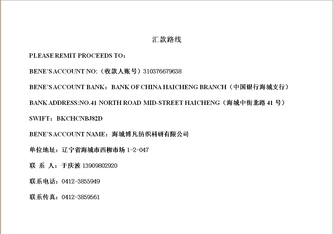 Foreign currency account BANK OF CHINA HAICHENG BRANCH, 310376679638 , NO.41 NORTH ROAD MID-STREET HAICHENG REMIT LINE   REMIT LINE