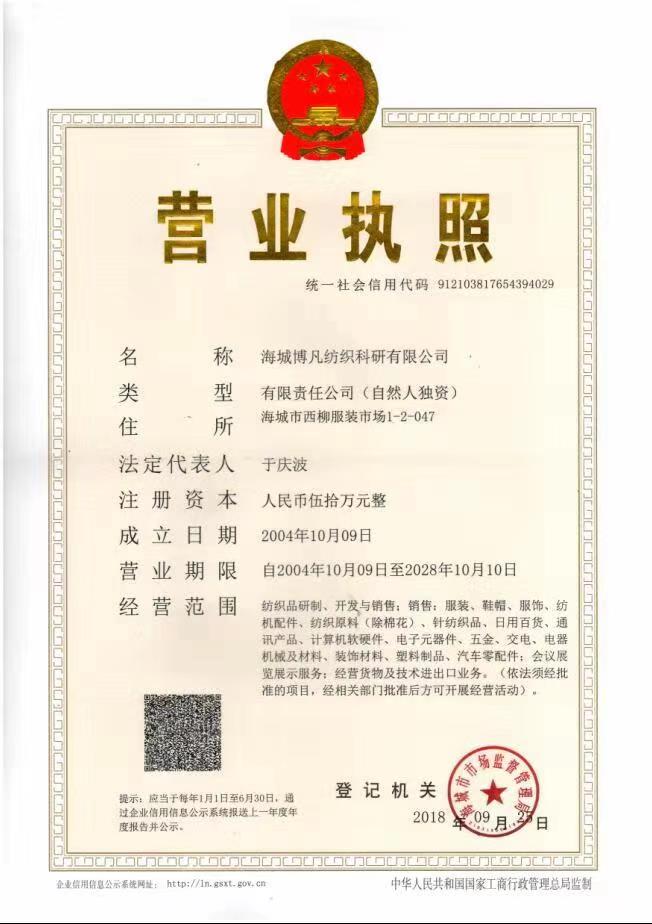 海城博凡紡織科研有限公司 開戶許可證